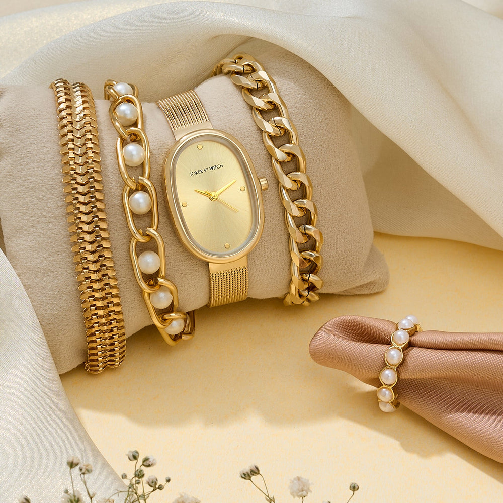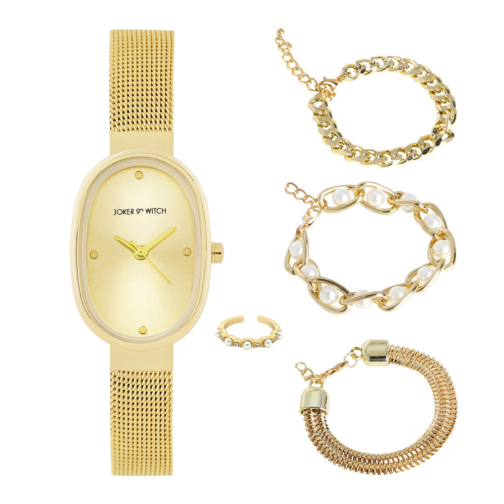 | Watch | Enola Aura Gold Oval Dial Watch with a Sleek Mesh Strap |