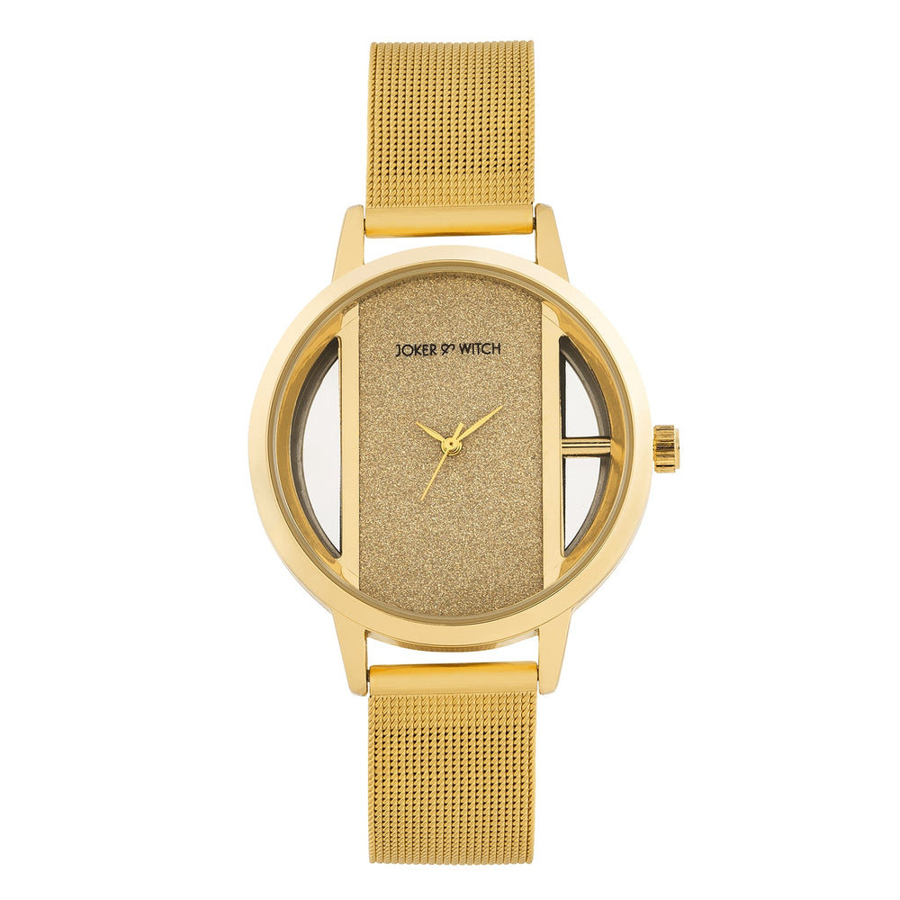 | Watch | Futuristic Gold Watch With A Glitter Dial And Mesh Strap |