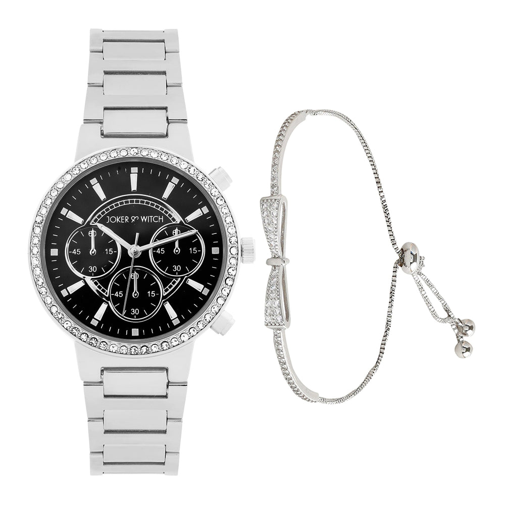 | Watch | Darleen Classic Silver Watch with Rhinestone Accents, Black Dial, and Metallic Strap |