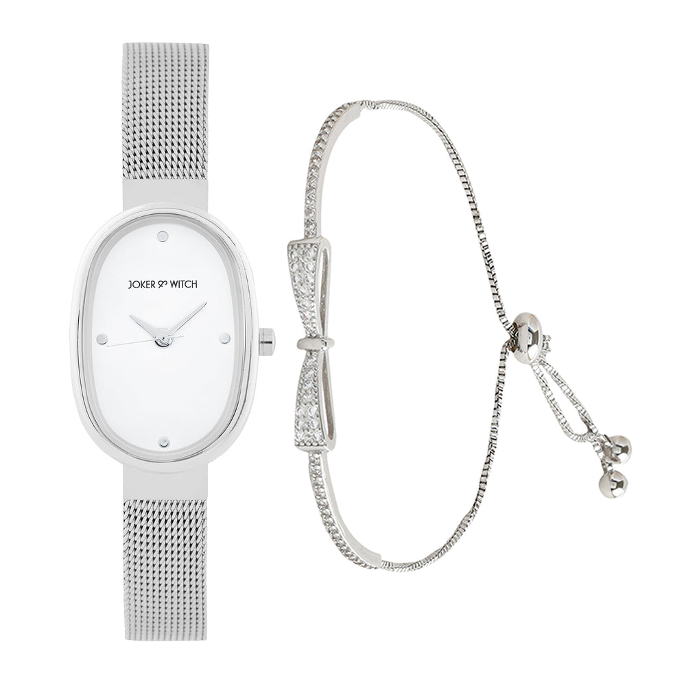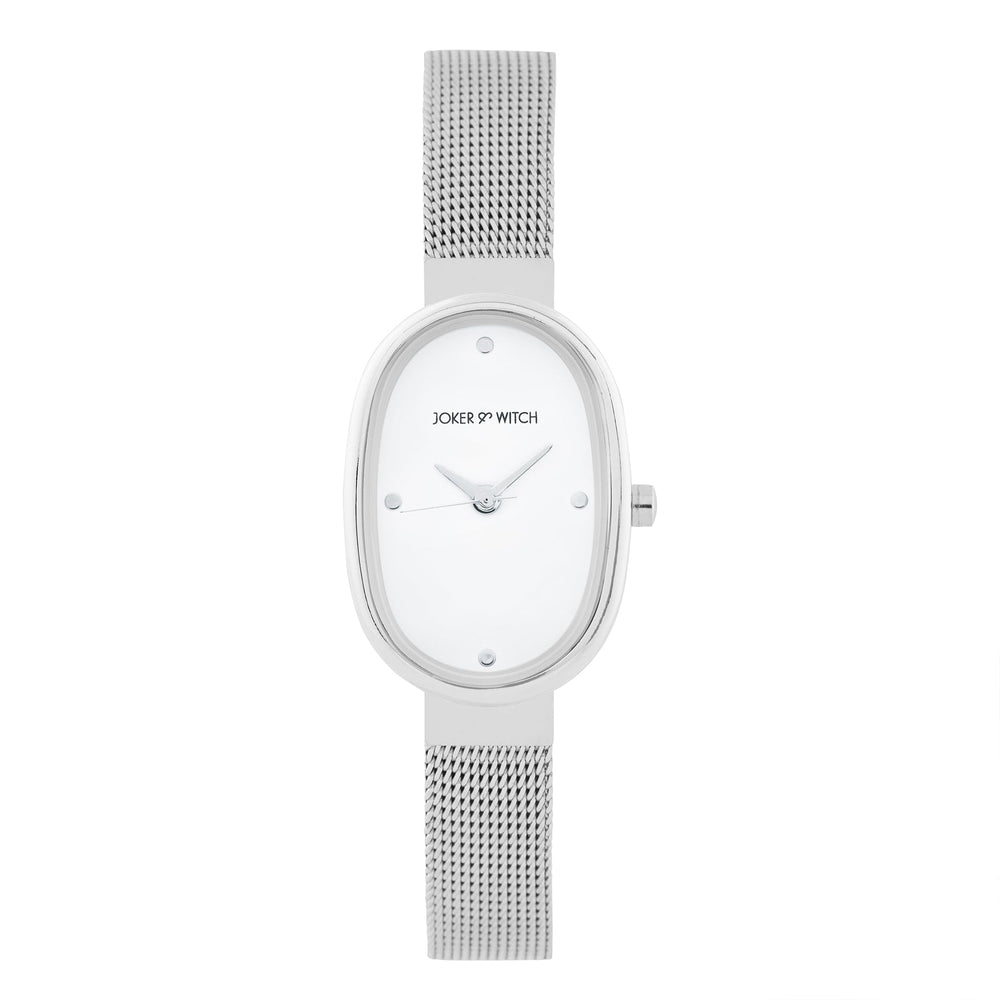 | Watch | Enola Aura Silver Oval Dial Watch with a Sleek Mesh Strap |
