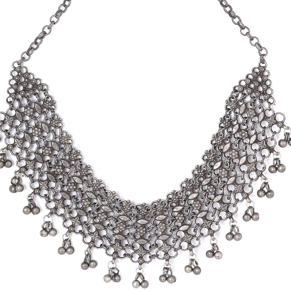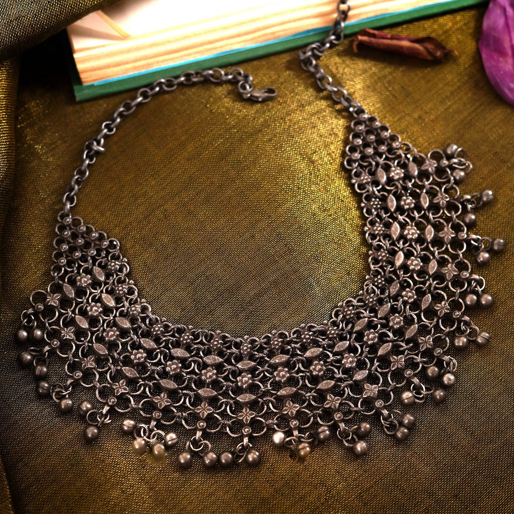 Every jewelry tells a story, and this one spells about a floral affair. Our Teejh Alvira Antique Silver Polish Necklace is pretty, delicate, and classy all at once. It features an elaborate piece with floral designs with tiny ghungroo danglers. With an ornate jewelry piece like this one, statement styling will only get easy! A beautiful necklace that will justify your occasion dressing.