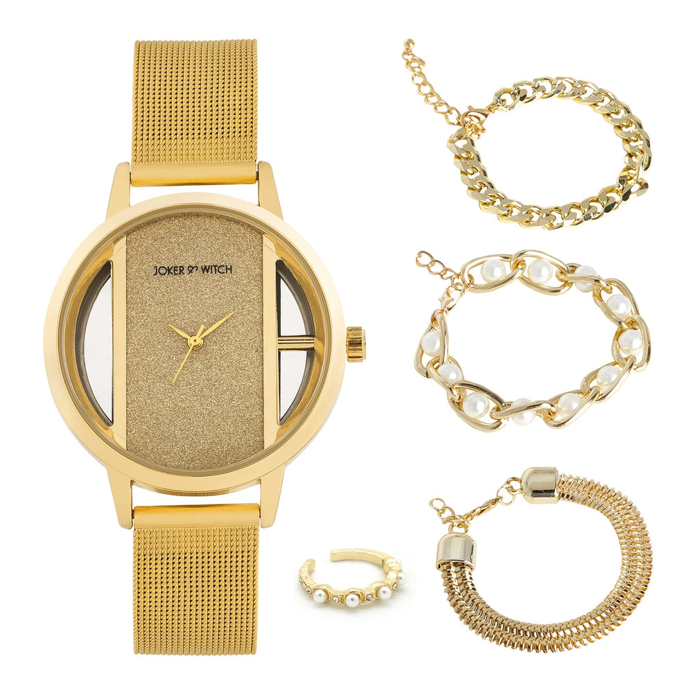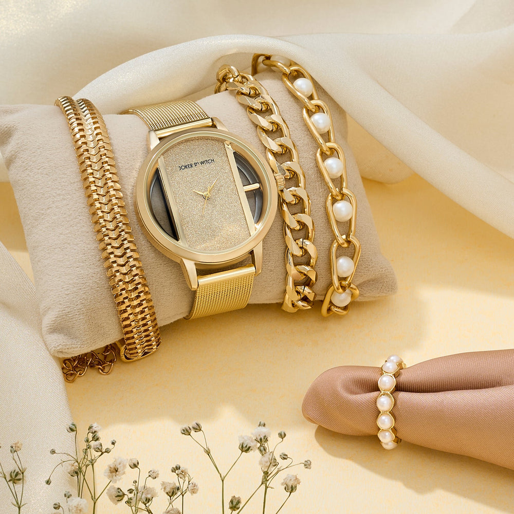 | Watch | Futuristic Gold Watch With A Glitter Dial And Mesh Strap |