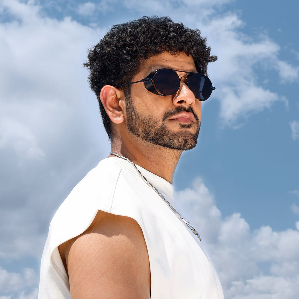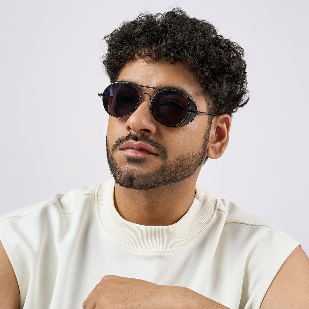 The Viz Side Shield Steampunk Sunglasses feature a round black frame with sleek side shields and black-grey lenses, blending edgy steampunk style with modern flair for a bold, distinctive look.